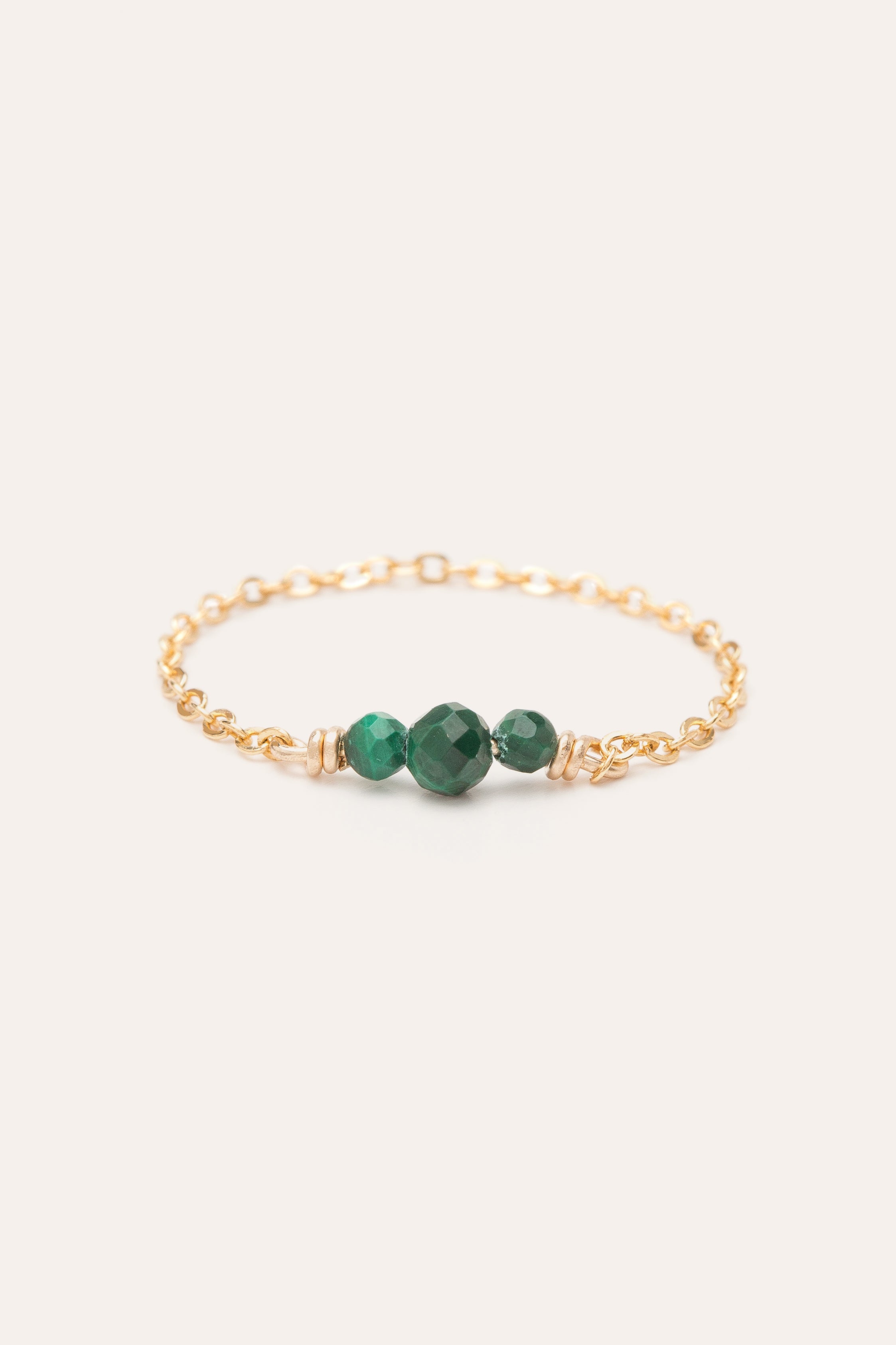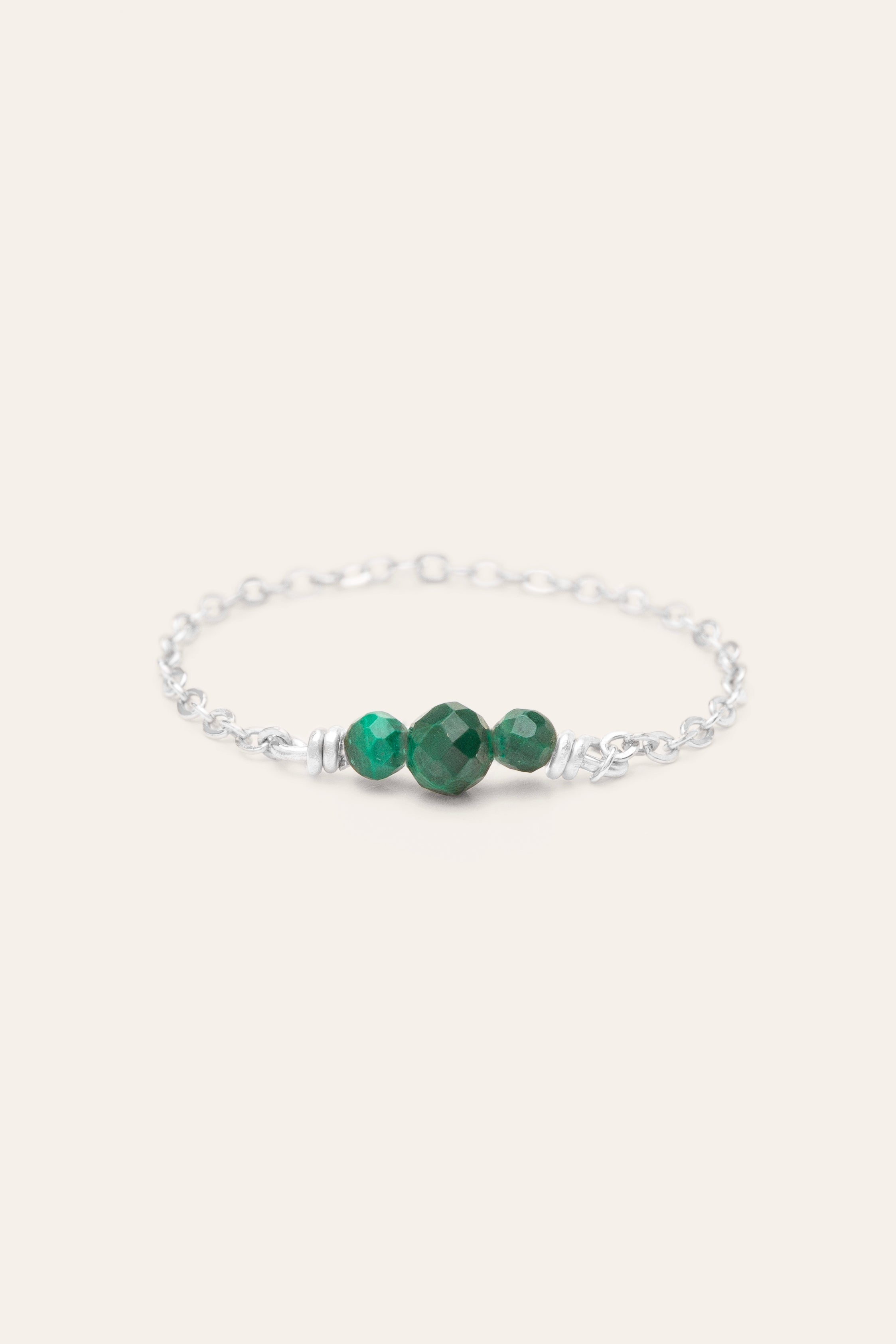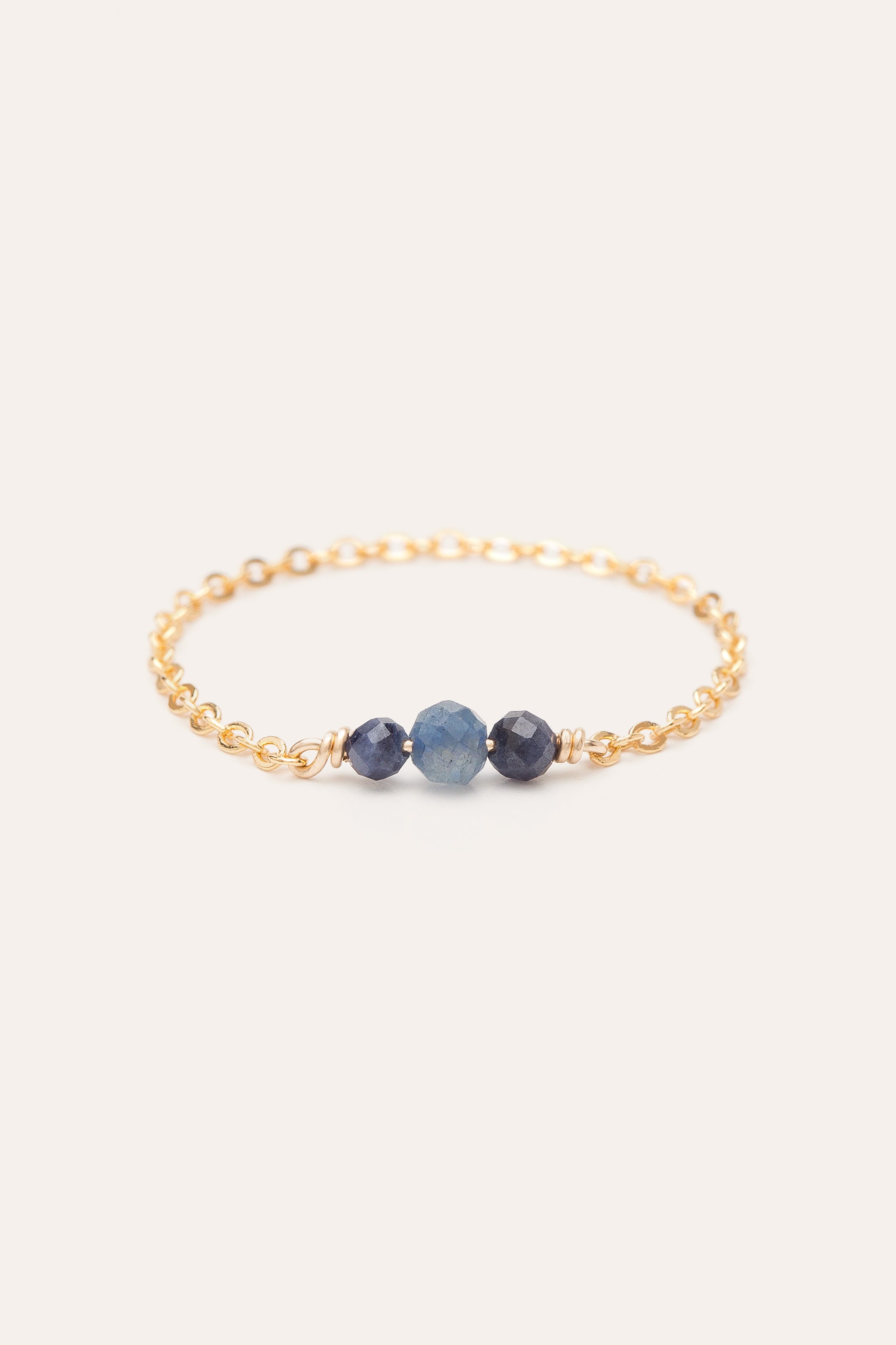 The Chance chain ring consists of a fine gold or silver chain and three faceted stones of different sizes and colors.