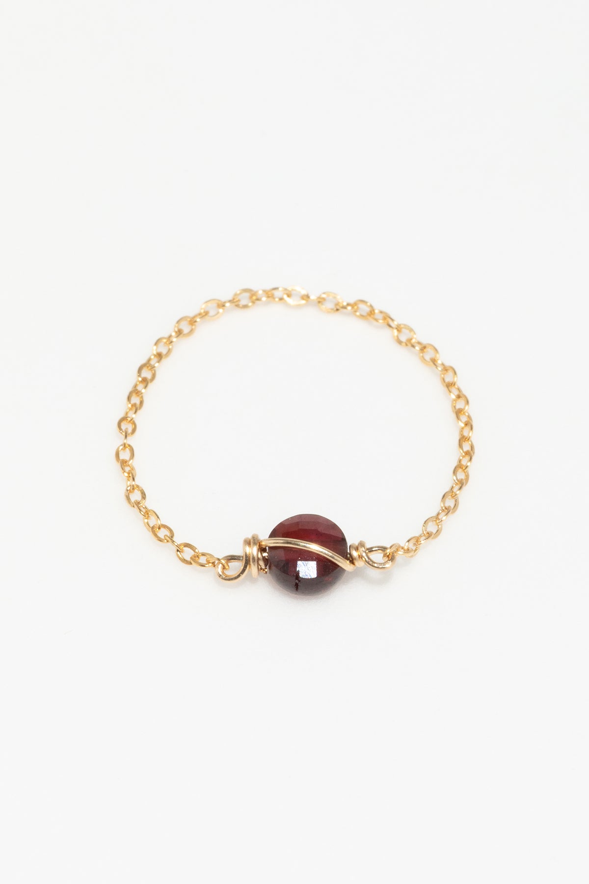 A fine, faceted stone is tied onto a delicate gold chain that adorns the finger with elegance and modernity.