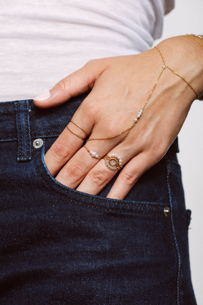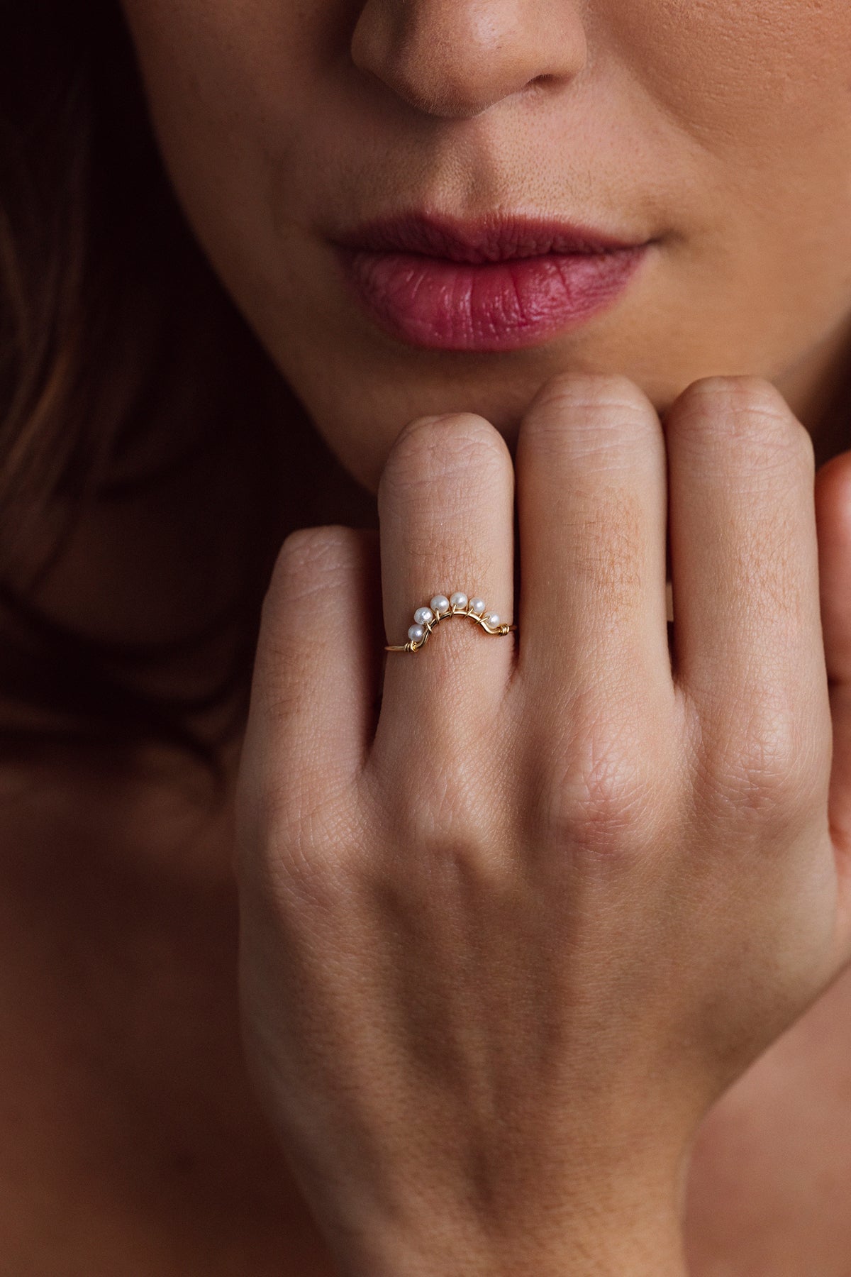 The Half Moon Lace ring features cultured pearl lace mounted on a smooth half moon shaped wire.