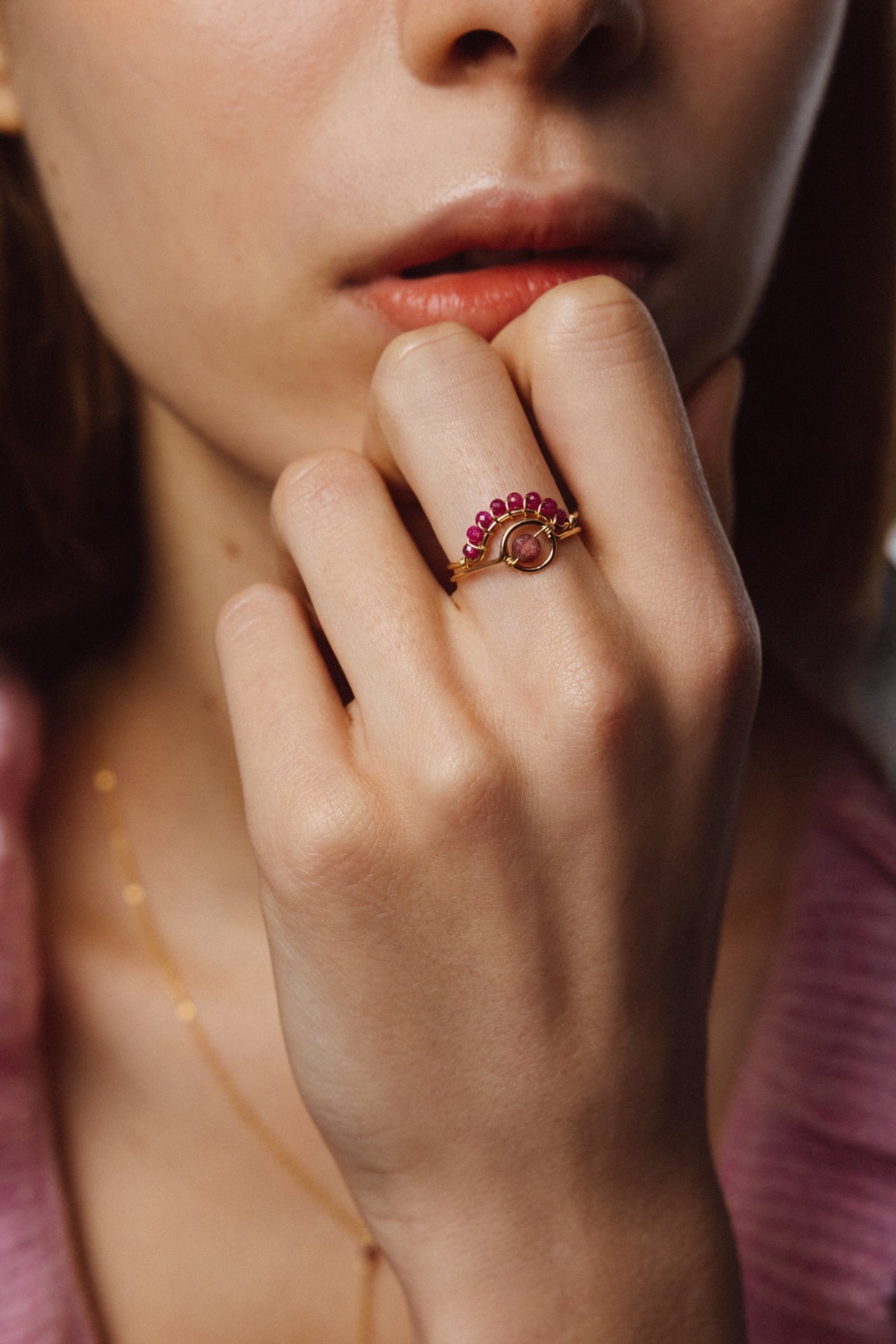 Curved and subtly woven with natural rubies, it slips gracefully around any solitaire in your collection, highlighting it with a stroke of light.