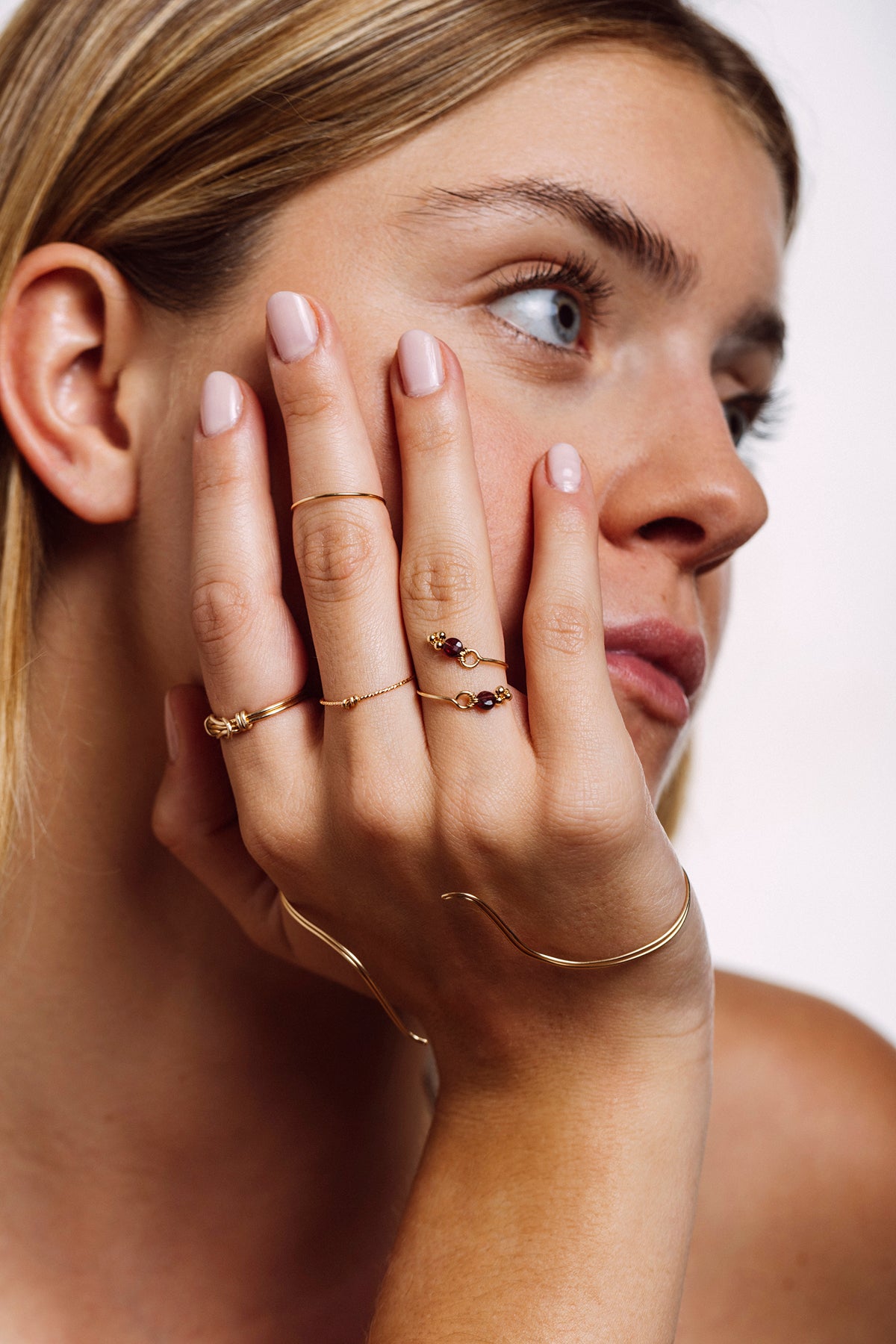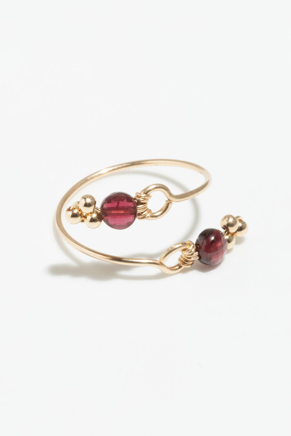 Two faceted garnets that respond to each other and overlap on the front of the finger, like a precious encounter.