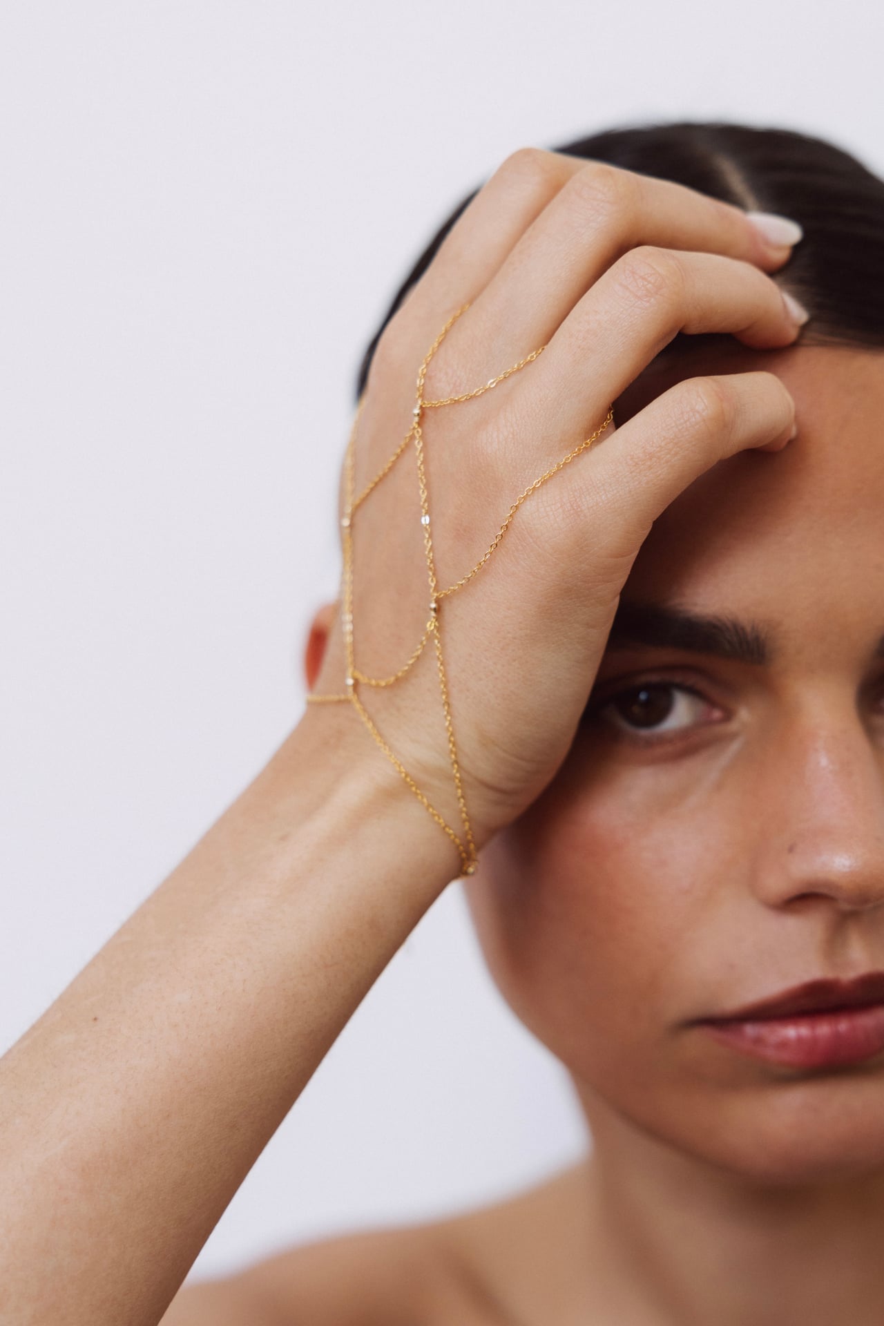 Second skin, this jewel slips on two fingers and attaches around the wrist like a bracelet.