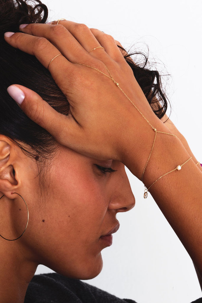 The 750‰ gold hand jewel is an elegant piece that dances on the skin following your movements. It reveals a gold chain with brilliant reflections linked by fine gold beads.