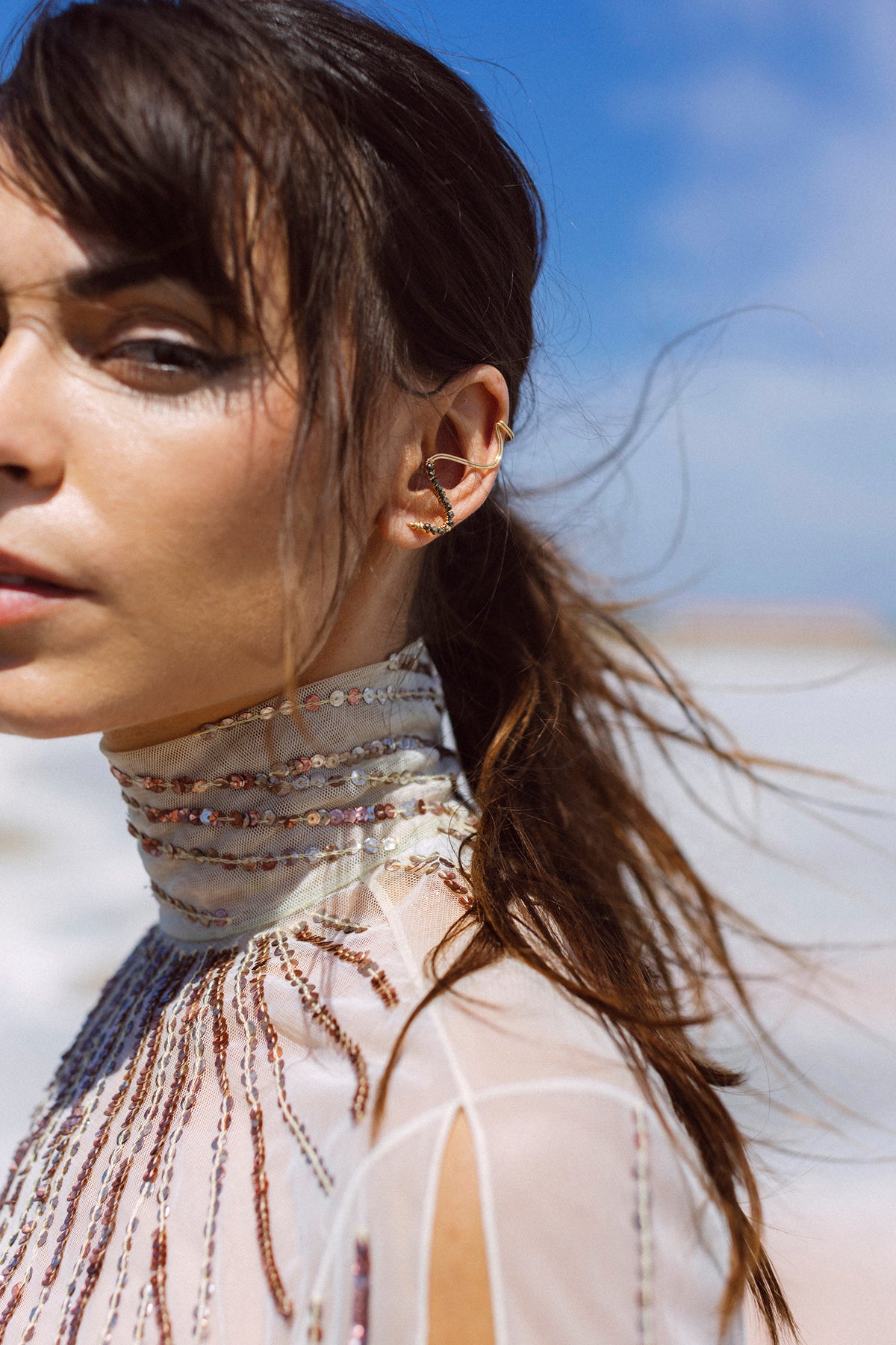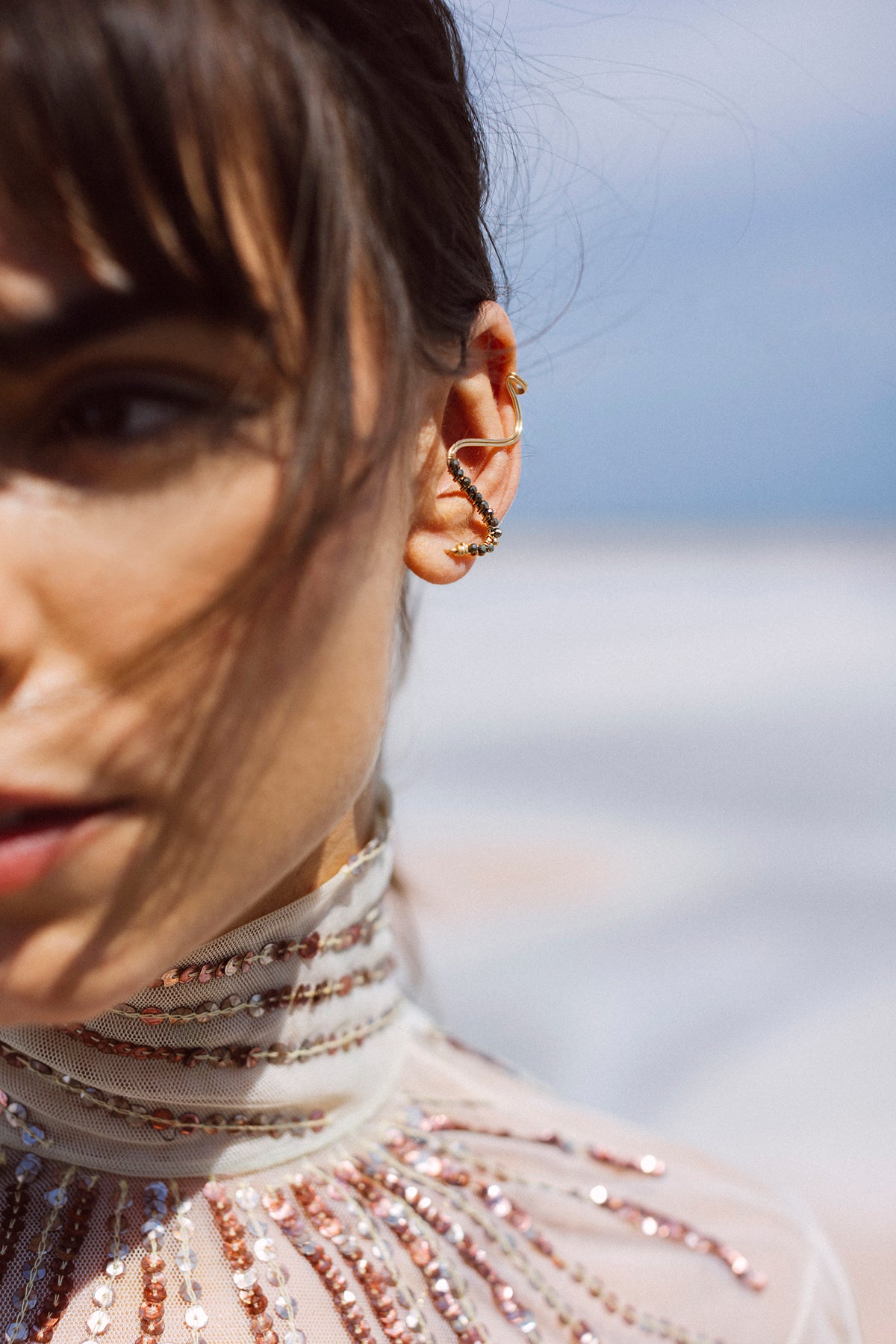 Mistral ear cuff, inspired by the mysterious force of desert dunes where the snake elegantly slithers. This sculptural jewel delicately encircles the ear, combining boldness and finesse to reveal a unique character. Handcrafted in our Parisian workshop, it embodies a perfect balance between power and femininity.