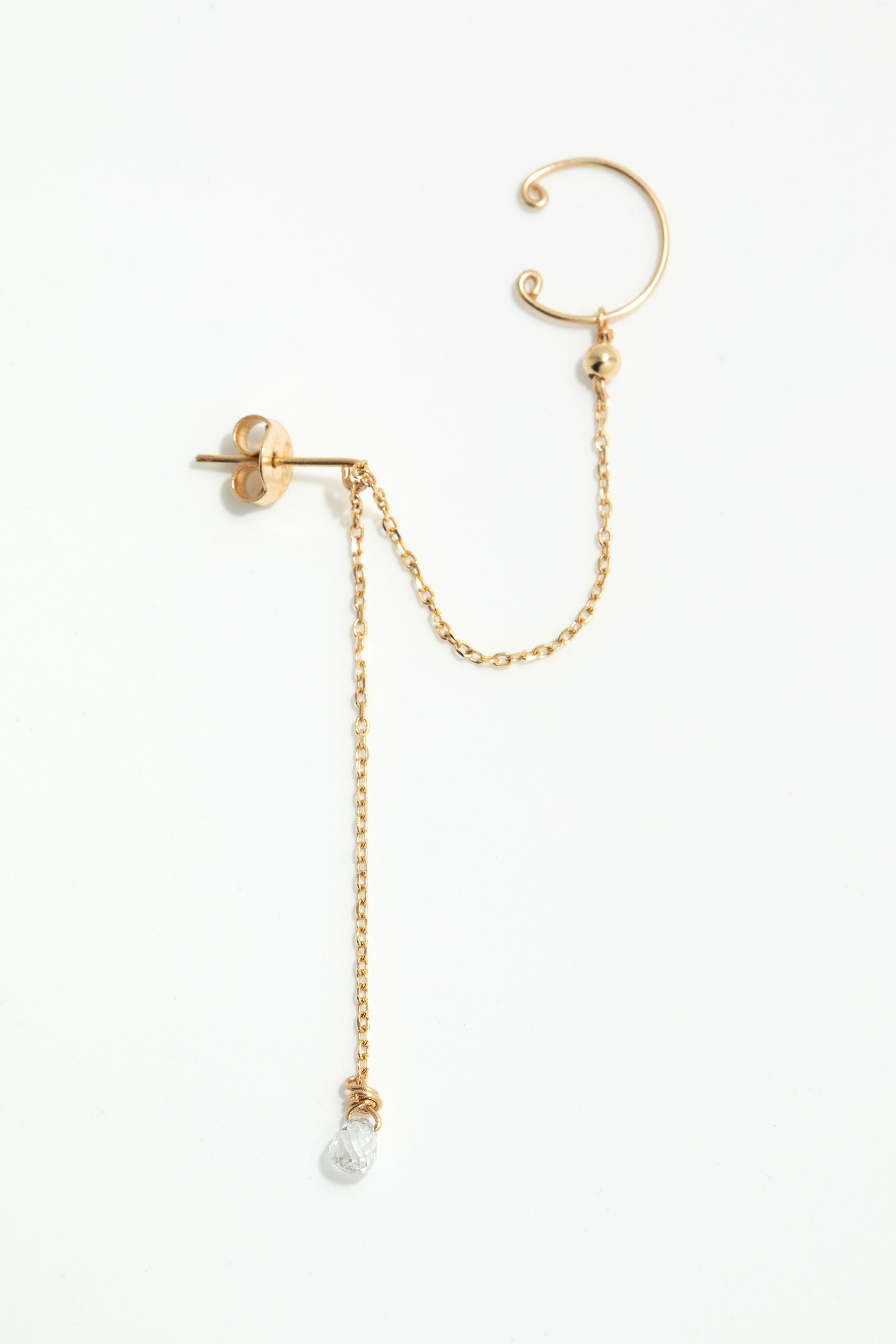 The Cléa earring stands out with its contemporary and refined design. A delicate chain, adorned with a fine diamond, drapes gracefully, while a second chain subtly sits in the hollow of the ear, creating the illusion of a faux piercing.