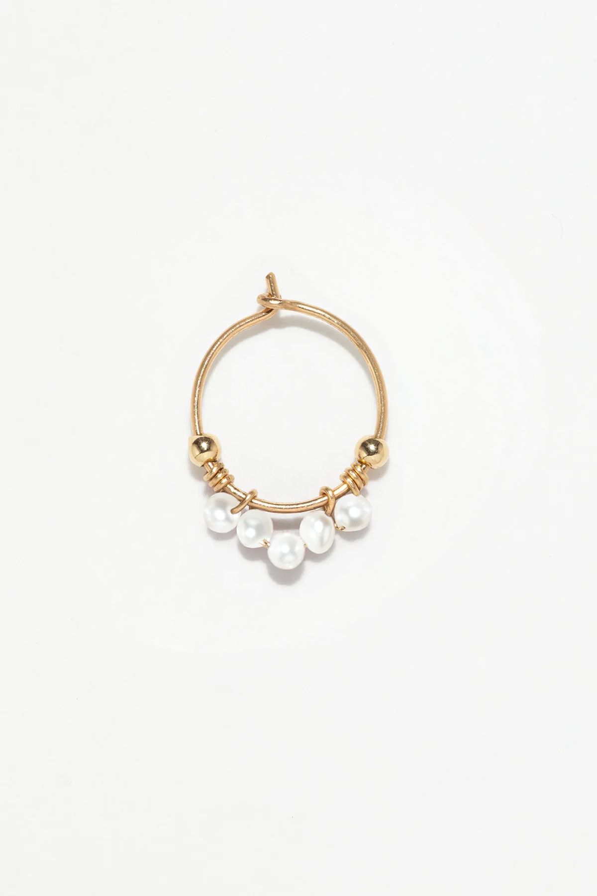 The mini hoop earrings are composed of small smooth rings in 14K gold filled, woven with five white cultured pearls, and two bright pearls.