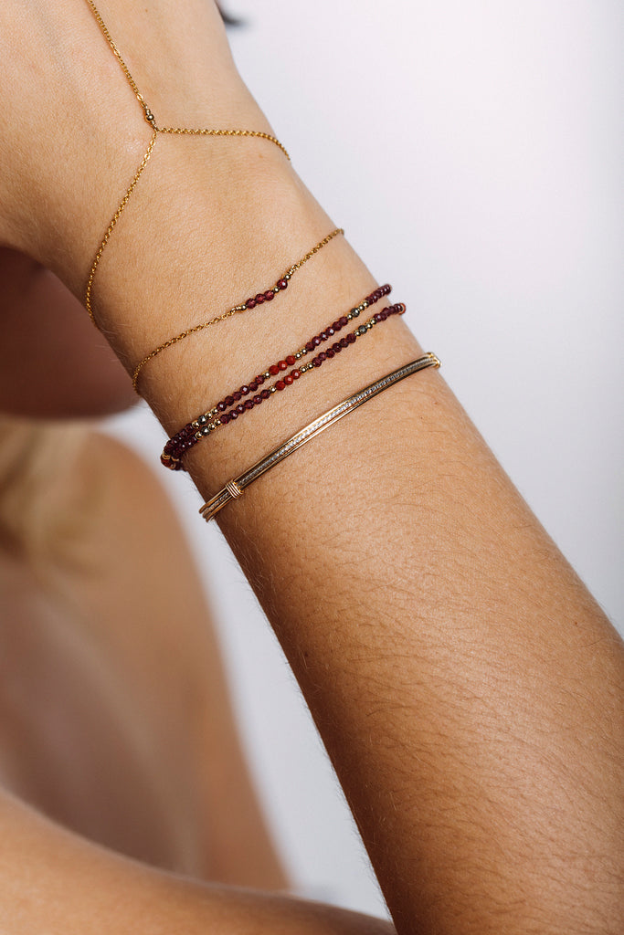 Multi-position, this jewel adorns the neck or wrist with a single or double turn.