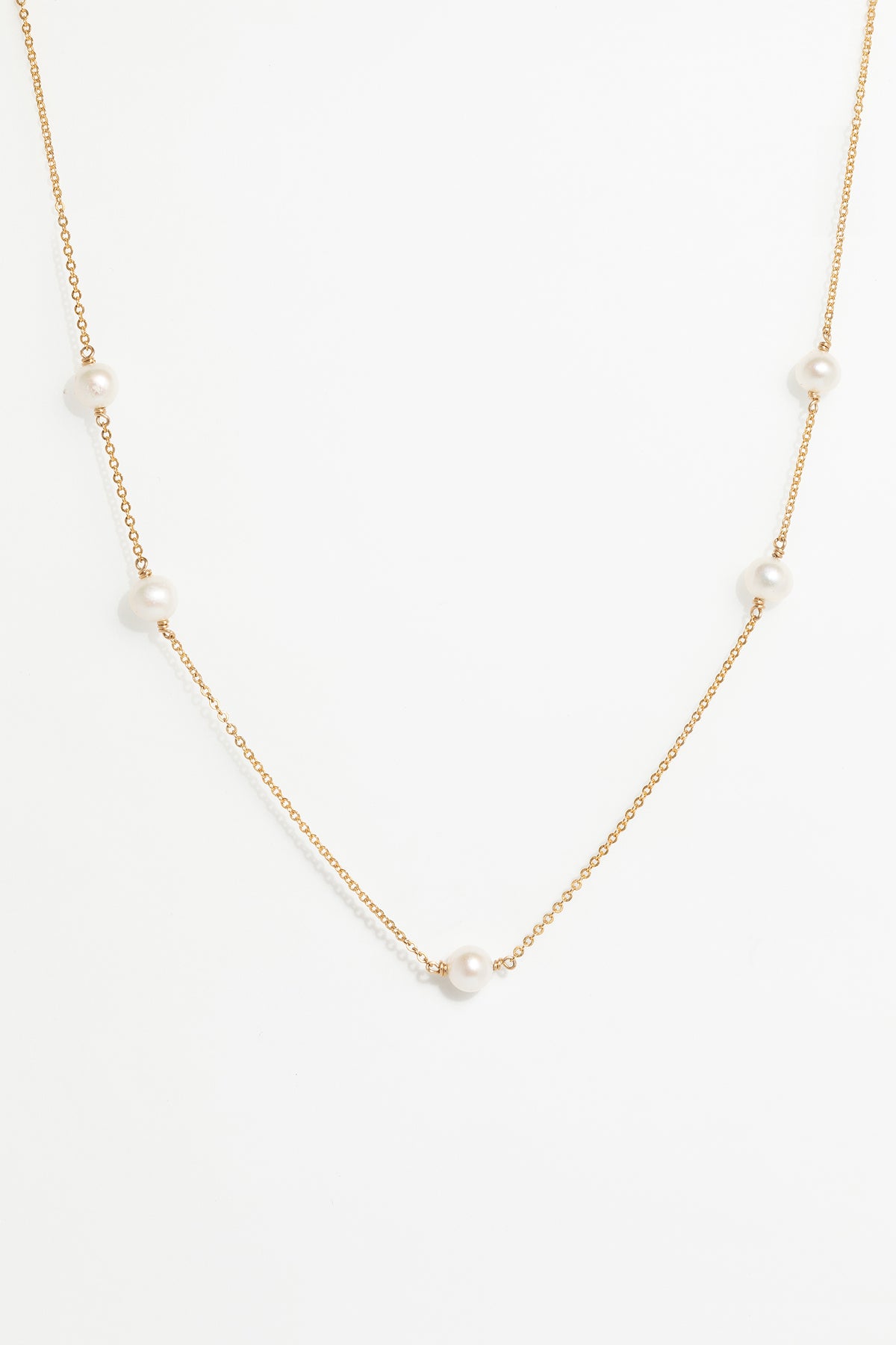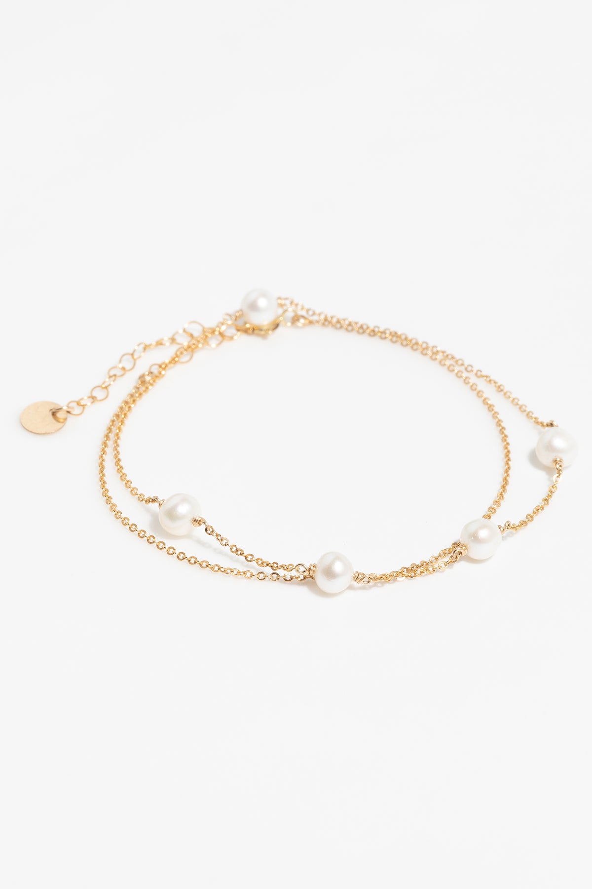 Its fine golden chain, punctuated with luminous cultured pearls, creates a play of softness and simplicity.