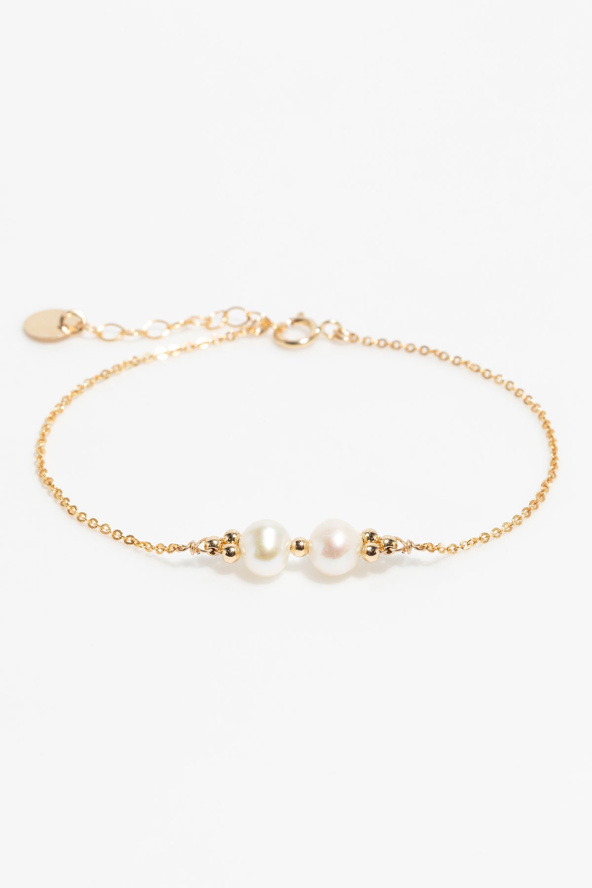 Delicate and symmetrical, the Yara bracelet reveals a fine golden chain adorned with two luminous cultured pearls, framed by two small fixed bells. A subtle balance between brilliance and finesse.