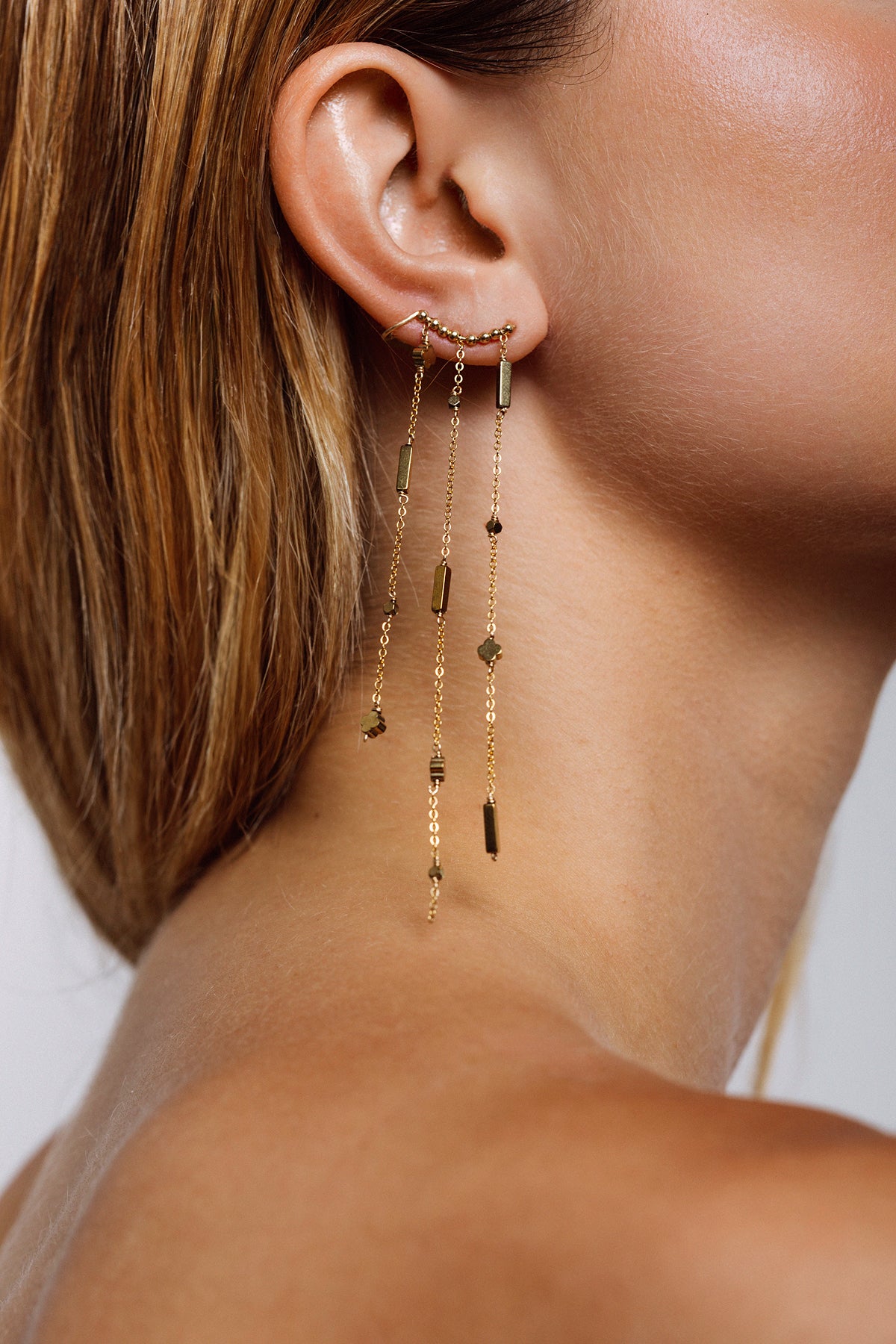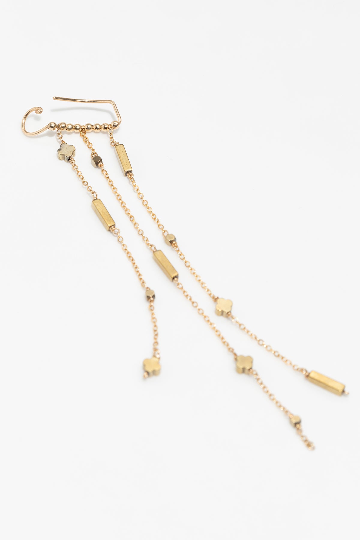 The Amaya climber draws an elegant curve along the lobe, punctuated by smooth beads that offer softness and finesse.