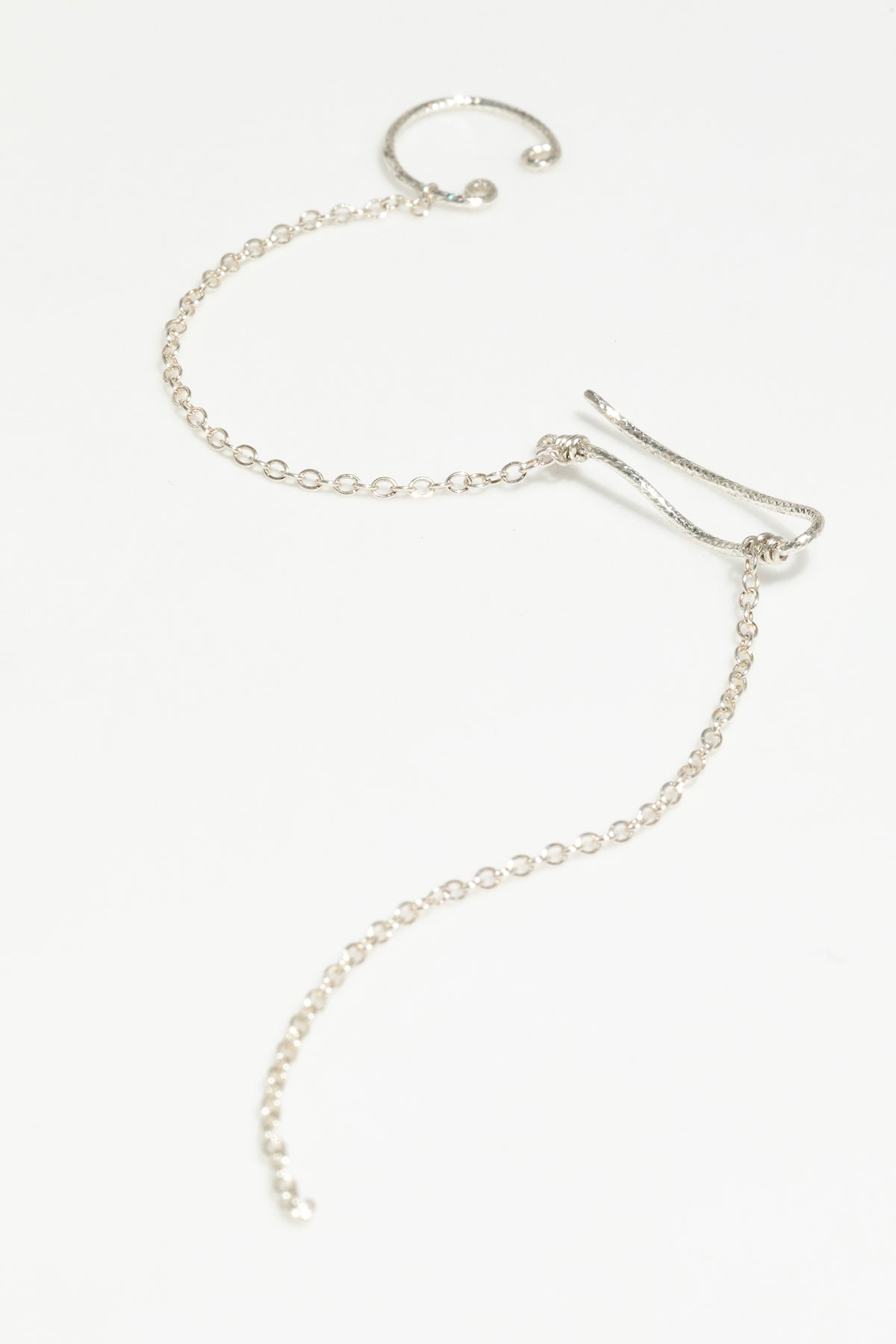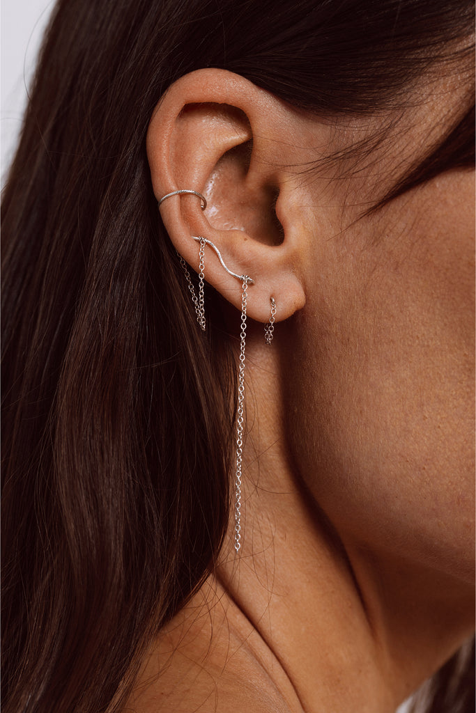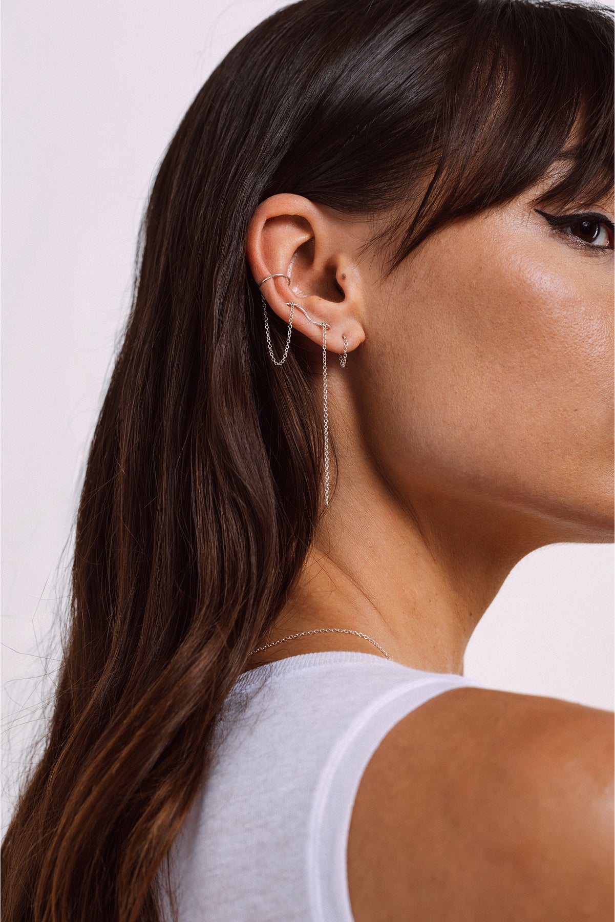 This Vaia climber adorns the ear with a fluid and light movement, like a wave gently caressing the skin. Its undulating silhouette unfolds along the lobe, one fine chain descends gently while another rises gracefully to the helix.