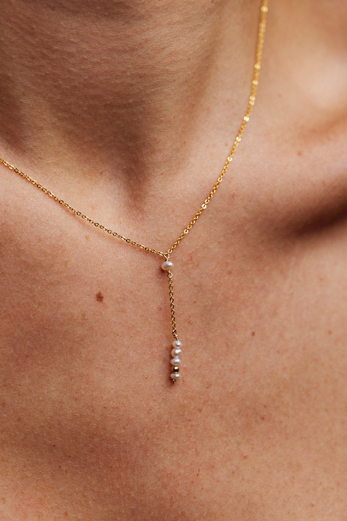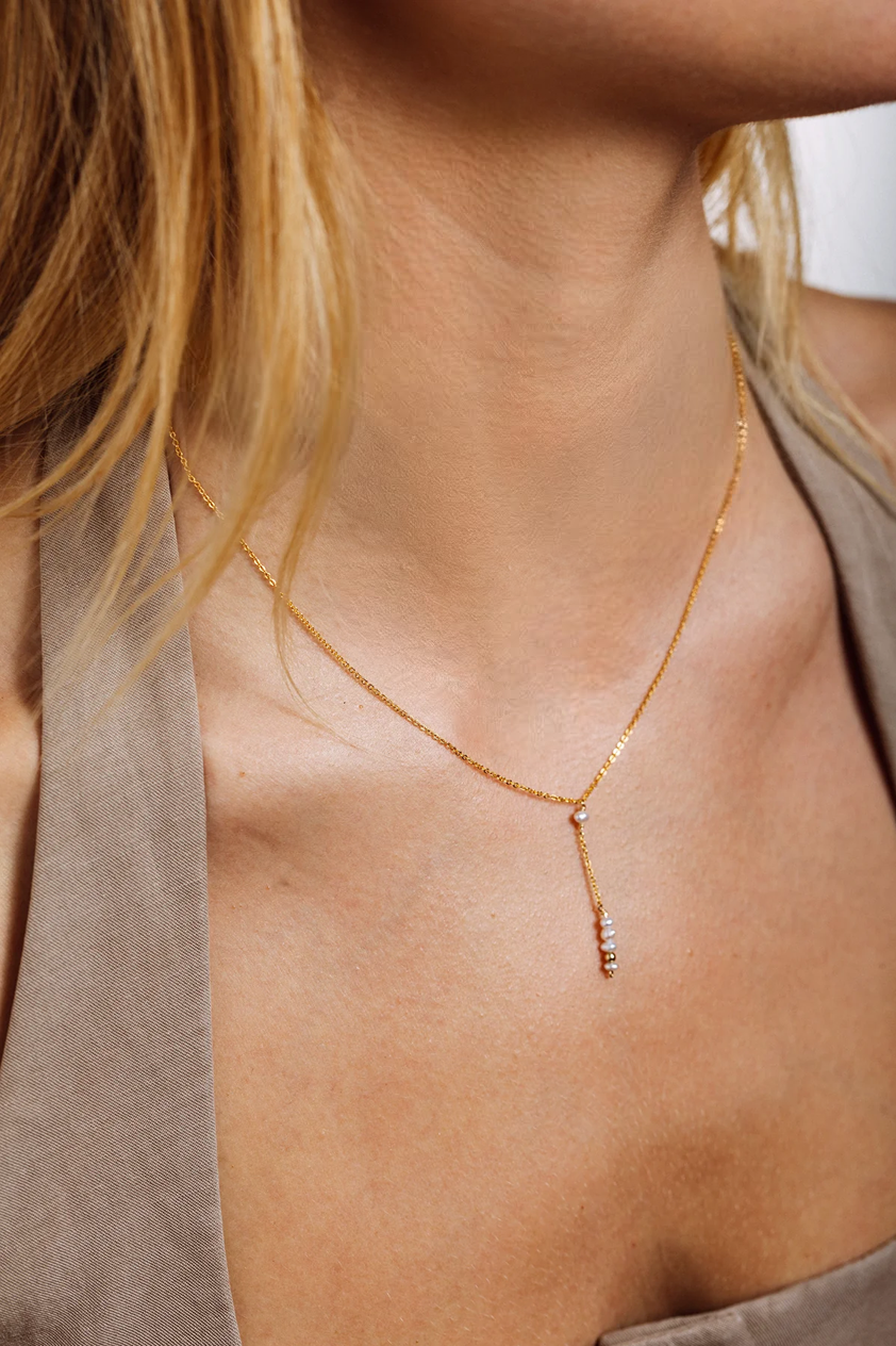 Light and elegant, the long tie necklace delicately runs along the neckline.