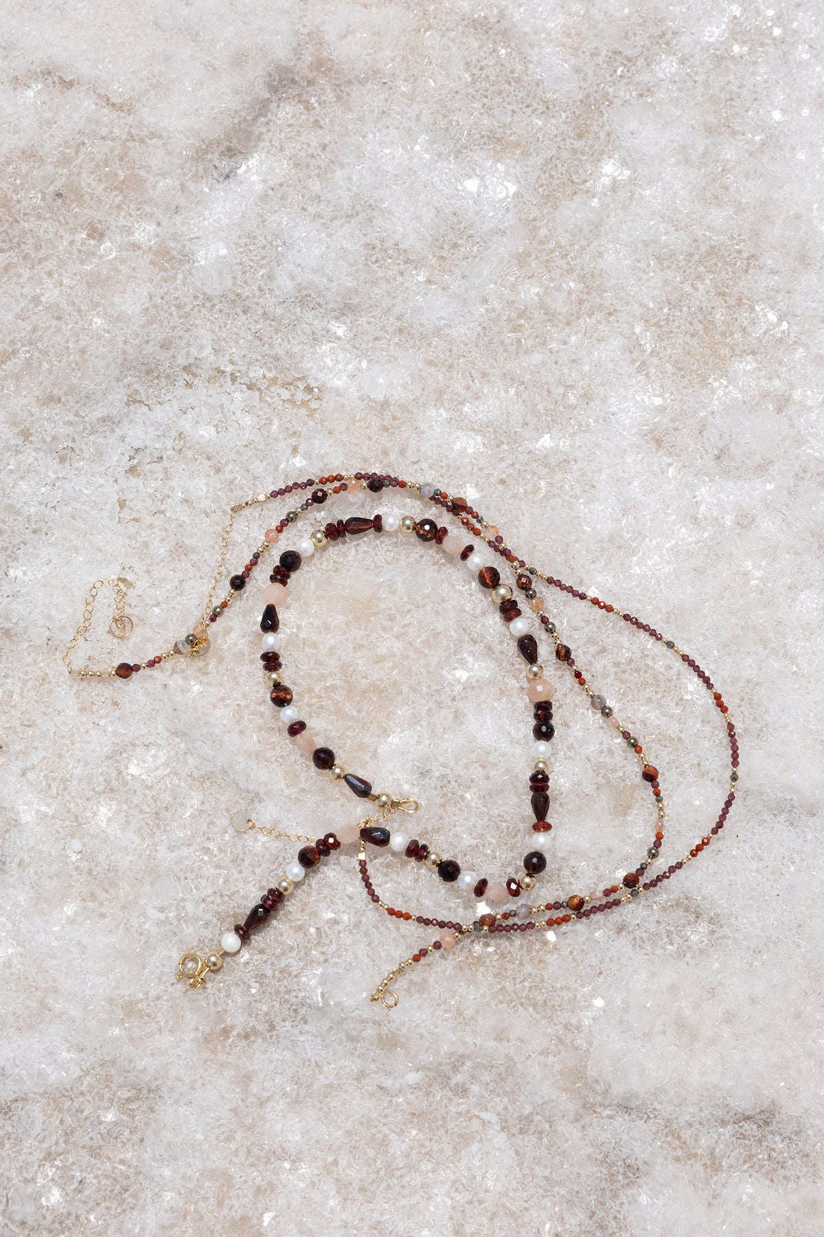 Natural stones between 2 and 6 mm: Red Garnet, Sun Stone, Bull's Eye, Red Jasper, Pyrite, Botswana Agate