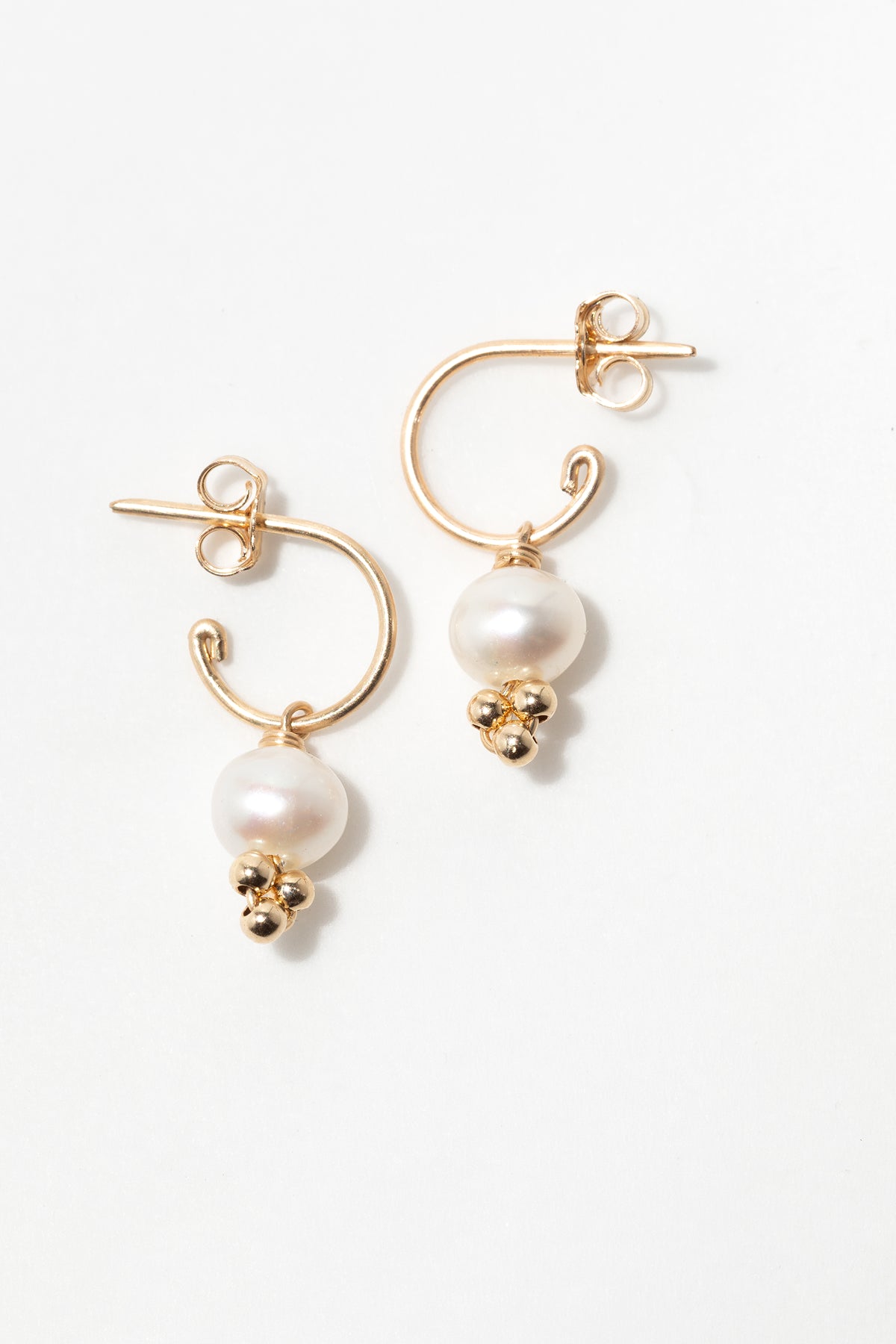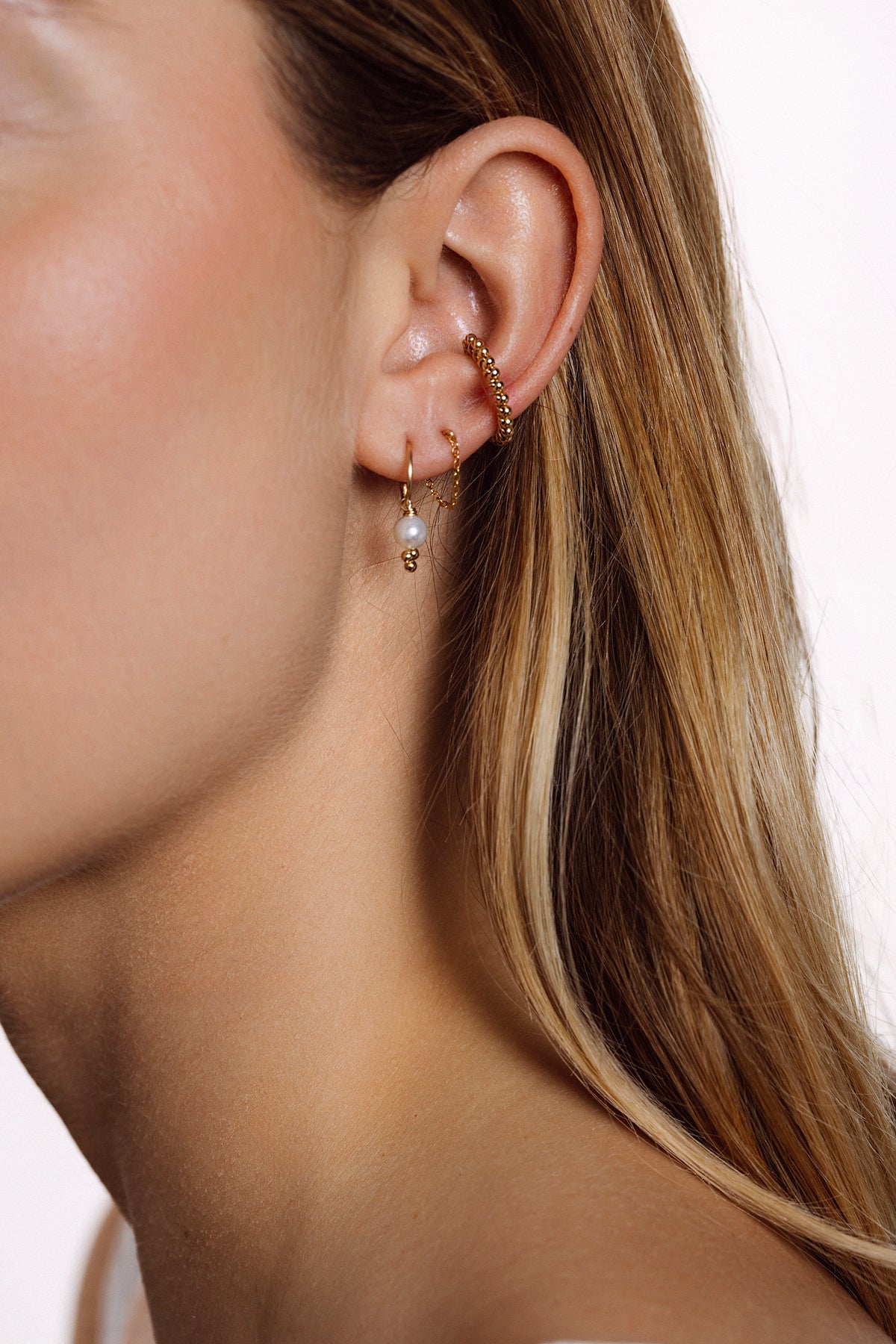 A cultured pearl, highlighted with three mini golden bell-shaped beads, dances as a pendant on a fine creole.