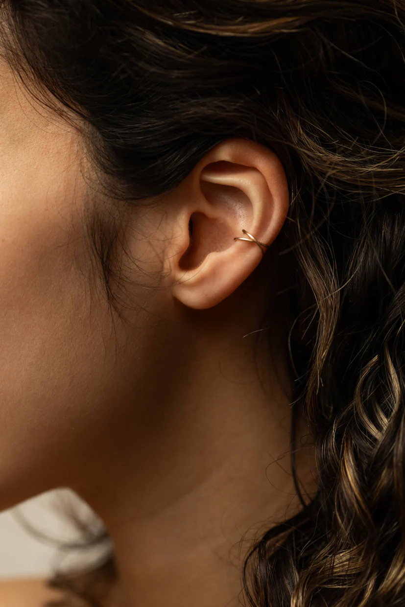This jewel allows you to adorn the ear with a precious detail and requires no piercing. This fake piercing, or ear cuff, is designed to accessorize the conch with a filigree motif made of gold wire.