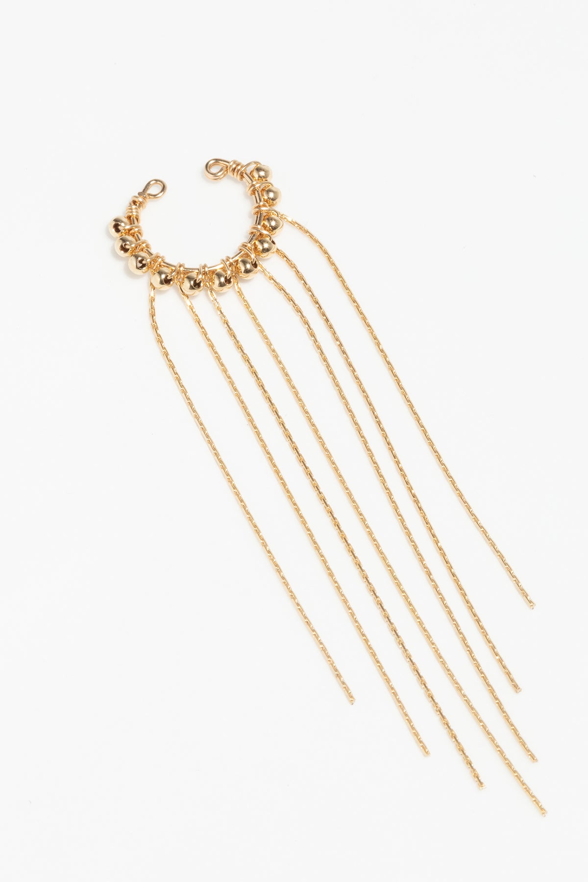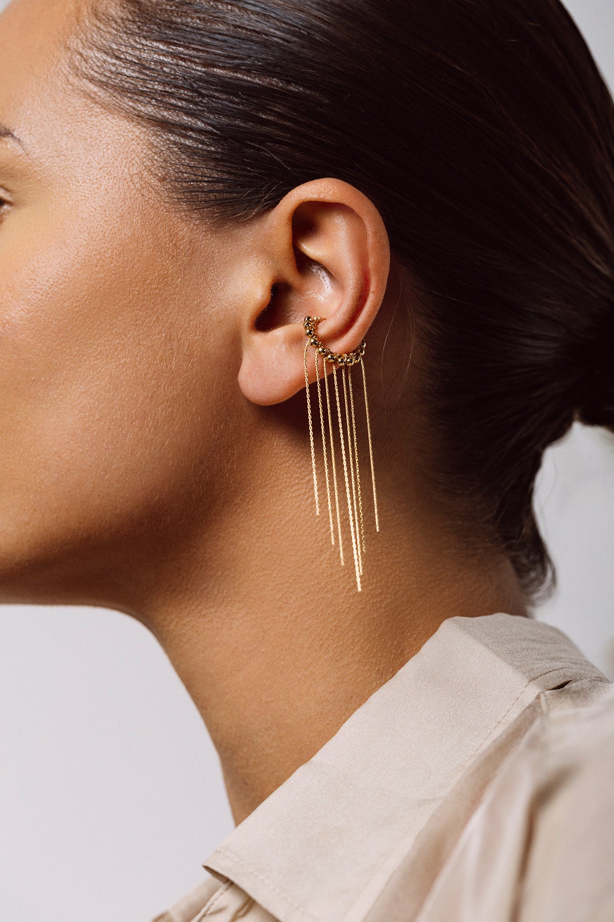 The Leïla faux piercing combines delicacy and boldness. Fine gold beads, handwoven using our signature technique, adorn the conch while light chain fringes add a fluid, airy movement. Inspired by the gentle breeze blowing over winter dunes, this unique piece, made to order in our Parisian workshop, enhances any look, whether alone or stacked, for a refined, contemporary touch.