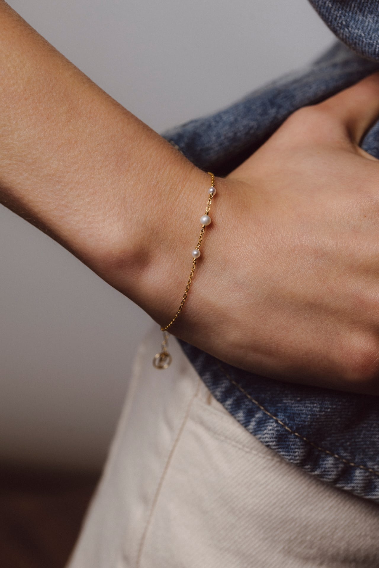 The Chance bracelet consists of three small cultured pearls of different sizes, mounted on a fine chain.