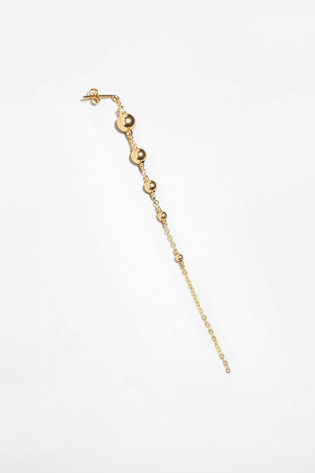 The Maia Chain Stud is a modern and elegant piece of jewellery, featuring a delicate 9.5 cm chain adorned with smooth round pearls. This stud earring adds a unique and sophisticated touch to your look, perfect for those looking for a distinctive accessory.