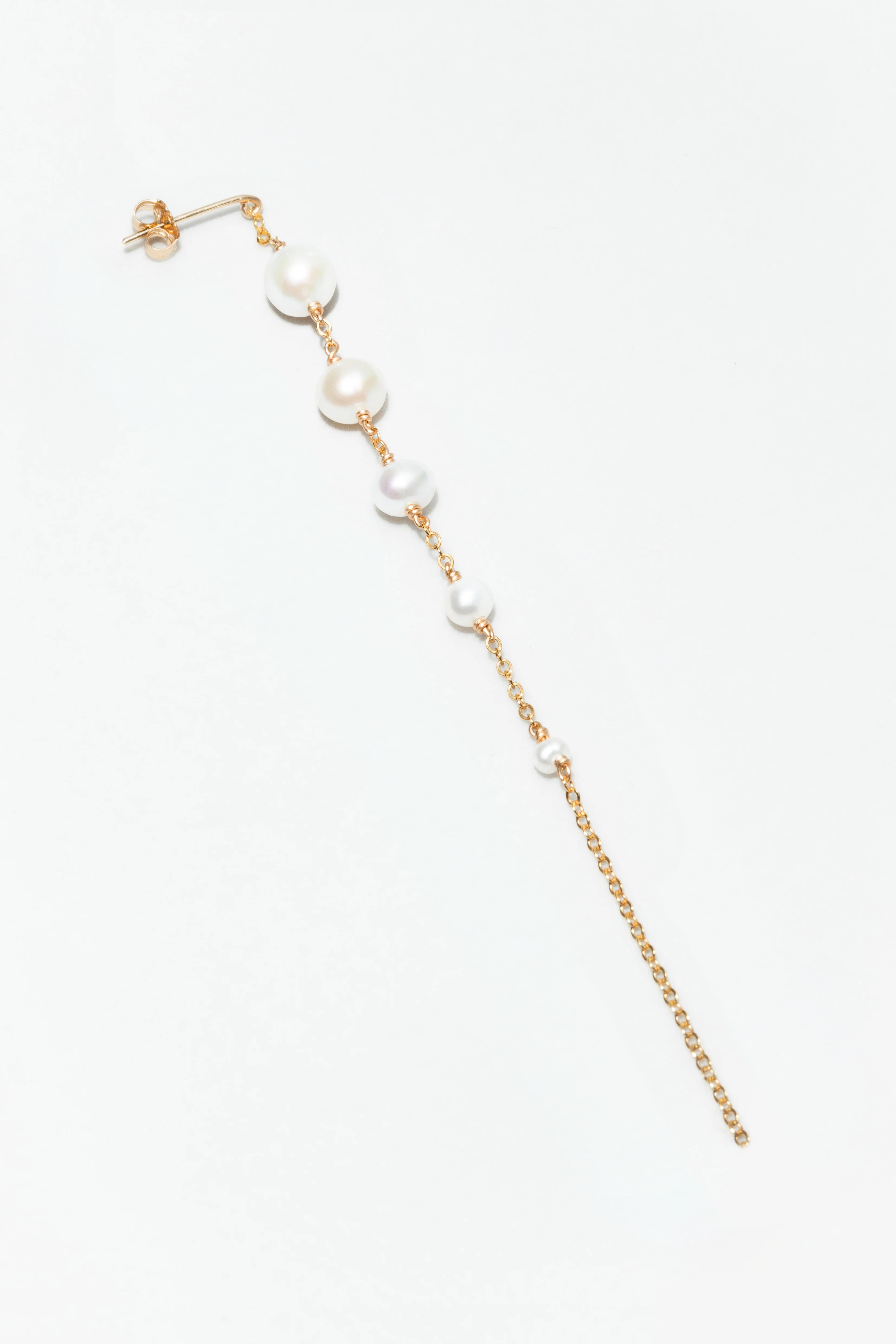 The Maia Chain Stud is a modern and elegant piece of jewellery, featuring a delicate 9.5 cm chain adorned with smooth round pearls. This stud earring adds a unique and sophisticated touch to your look, perfect for those looking for a distinctive accessory.