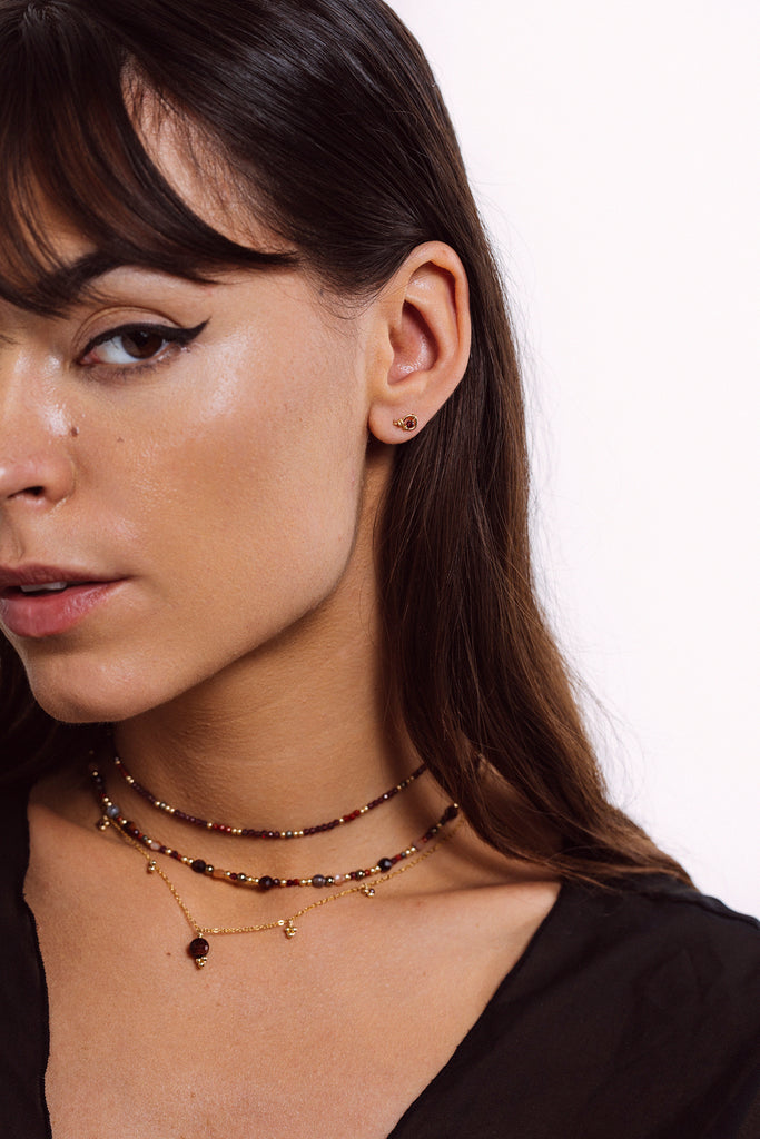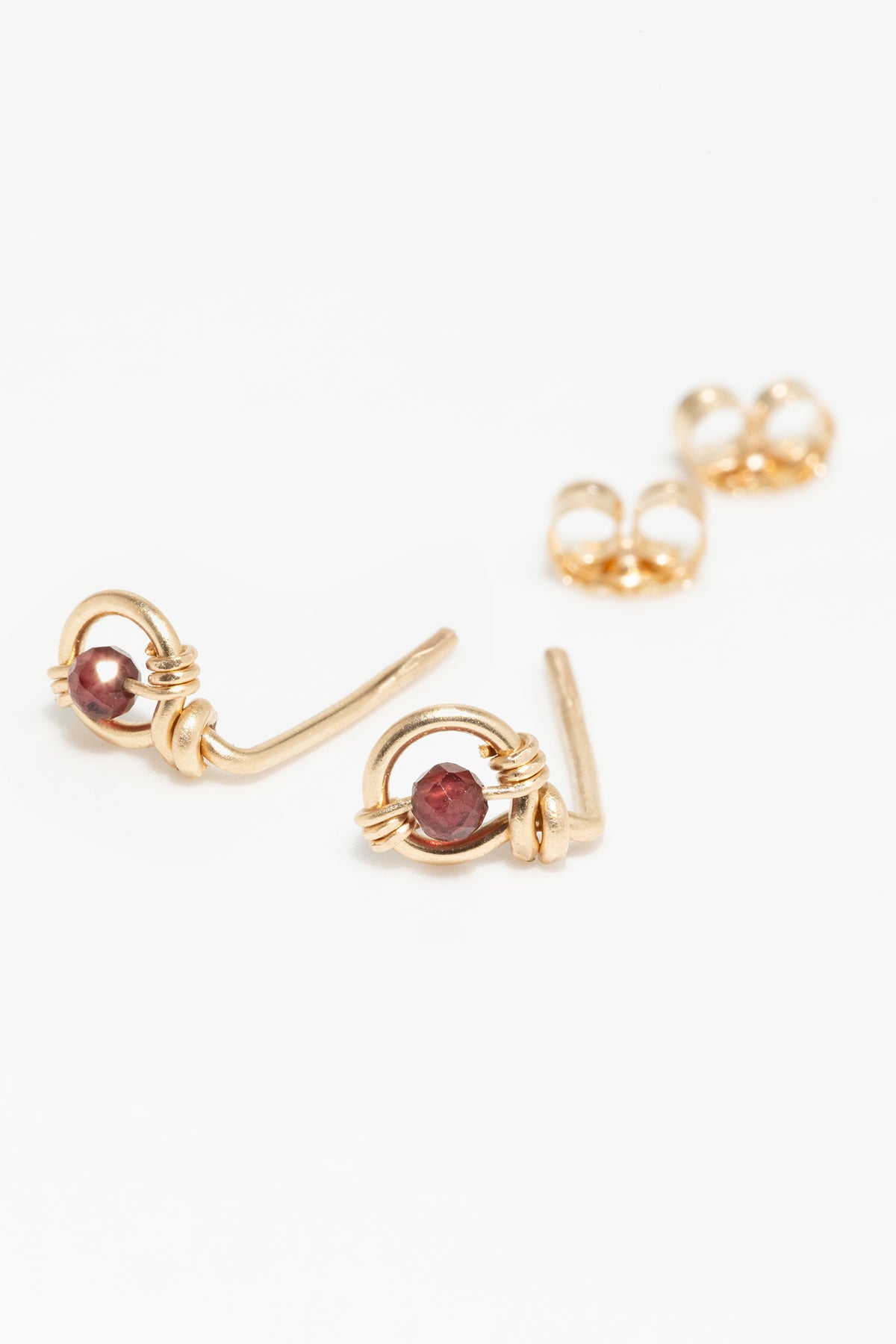 Inspired by an enveloping and protective structure, the Pina studs reveal a delicate ring formed from a gold wire, encircling a garnet like a treasure.