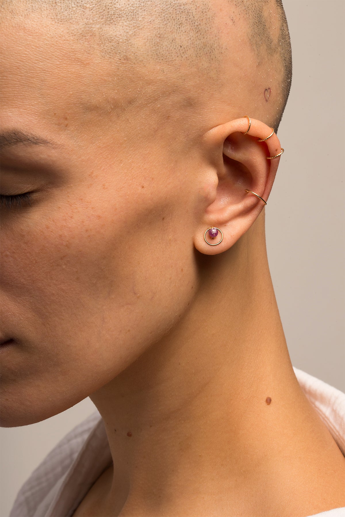An interpretation of the solitaire, the Swan studs showcase a natural stone woven onto a precious gold thread. With precision, the handwork creates a rounded hoop to accommodate and enhance this central element on the jewel.